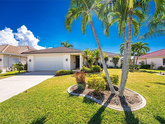 Waterfront home in Punta Gorda Isles! 3/2/2 split floorplan, 1744sf, power boat saltwater canal, 1 bridge to big water access! Come see this beautiful home and fall in love! Great views, quick access out, situated in a friendly, deed restricted small town waterfront community with nearby golf courses, a yacht club, country club, with a "Community Civic Association" if you wish to join for activities and events. Punta Gorda has a quaint historic and downtown area, many parks along Charlotte Harbor, and the county, a walking/bike path that is pet friendly, local shops, restaurants, boating, fishing, tours, free bike use, festivals, farmers markets, and many events all year long. The screened front entry of this lovely home brings you into the Great room that has a wall of pocket sliders to the screened lanai that overlooks the saltwater canal with a paver Landing area near the private dock. There is electric near the dock. The front windows in the Great room have plantation shutters, a vaulted ceiling, tile floors and a ceiling fan. The Kitchen and casual dining area also have a wall of sliders that enjoy the lanai and water view. The hallway to the kitchen has a large front closet and a pantry closet. The kitchen was updated with white cabinets, several banks of drawers, quartz counter tops, stainless appliances, glass backsplash, under cabinet lighting, a skylight, and breakfast bar that separates the the kitchen from the casual dining. The primary bedroom is off of the Great room. There are 2 closets, 1 is a walk-in closet with a window. This large bedroom is in the back of the home and also has a great water view. The bathroom has been updated with a wood vanity, granite counter top, and a large mirror vanity. The toilet and walk-in shower are in a separated by a pocket door and has 2 windows. The guest bedrooms, laundry room and garage are on the opposite side of the home. The 2nd and 3rd bedrooms have beautiful engineered wood flooring. The 2nd bedroom has a wall of closets. The 3rd bedroom is accessible through frosted glass French doors in the 2nd bedroom. the 3rd bedroom has a closet 2 walls of windows, a skylight and a slider out to the Lanai. This room was used as an art studio; It's a great flex room. The guest bathroom has a beautiful hand painted mural from the previous owner. The bathroom vanity and granite countertop was also updated. The inside laundry room has a window, built in desk, large closet, sink, and additional cabinets. The large 27x21 screened Lanai is partially under roof, another hand painted nature scene on one wall, and has a cool deck finish. There is a in ground hot tub that does work, but has a leak near a top jet. It is being sold as is. The concrete dock and paver landing, near the waters edge, was added in 2024, added 3rd bedroom 2011, hot water heater replaced in 2021, metal roof 2023. some plumbing feeder lines under the sinks were replaced in 2022. This lovely home has accordion shutters and has never flooded. The home has tile throughout most of the home, engineered wood flooring in 2 rooms and ceiling fans in many rooms. The garage has a workshop area and additional closets. Enjoy the 3D tour of this little gem. Contact me for assistance. Make an appointment to walk through and fall in love!