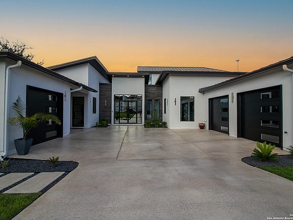 Welcome home to this custom built 5 bedroom 5 bath located in the highly desirable Canyons at Scenic Loop subdivision! This contemporary two story home sits on .66 of an acre. Beautiful landscaping and mature trees. You are greeted by a spacious entry that leads to the dining room. The dining has high ceilings & opens to the family room. Office space w/outdoor access off of the entry. The family room features great windows w/picturesque views, electric fireplace, built-ins and tray ceilings. The kitchen is a chef's delight featuring a stainless steel Kitchenaid appliance package: 36" Commercial Gas Range Top w/6 burners, 36" canopy hood, a built in 30" Microwave & Oven, 24" dishwasher & 48" Side by Side Built-in Refrigerator! Nero Marquina Quartz countertops, custom cabinetry, waterfall counters on the island w/seating and expansive walk-in pantry! The secluded first floor primary suite features views of the backyard, gorgeous soaking tub, walk-in shower, two separate vanities, and spacious walk-in closet. First floor flex space currently used as a nursery. First floor secondary bedroom w/full bathroom. All bathrooms feature Horizon Black Smooth Granite countertops. The second level features 3 great sized secondary bedrooms & two full bathrooms. One has access to a balcony overlooking the backyard. The Outdoor living space features a gorgeous pool and hot tub w/amazing views, an outdoor kitchen w/Black Forrest Granite Countertops, grill & mini-fridge, ceiling fans in the main patio space, modern black railing, second seating area, tons of shade, impressively sized storage area and access to the remaining yard. Amazing place to entertain! Westinghouse water softener! FIVE insulated garages w/epoxied flooring: Three attached to the main home & two in a detached structure. The attached garages are prewired for electronic vehicles. The detached garage has high ceilings for potential to accommodate car lifts, oversized garage doors, a huge loft space and prewired for a mini-split. Great for a car enthusiast! Generator already installed. One of the closets is constructed to work as a safe room. One of kind property! Easy access to I-10, La Cantera, The Rim, tons of shopping and restaurants. NISD School District!