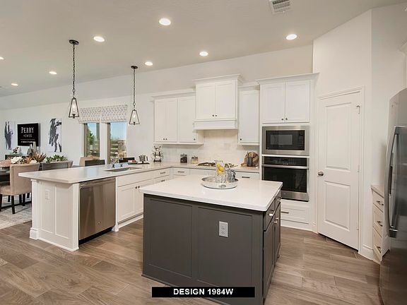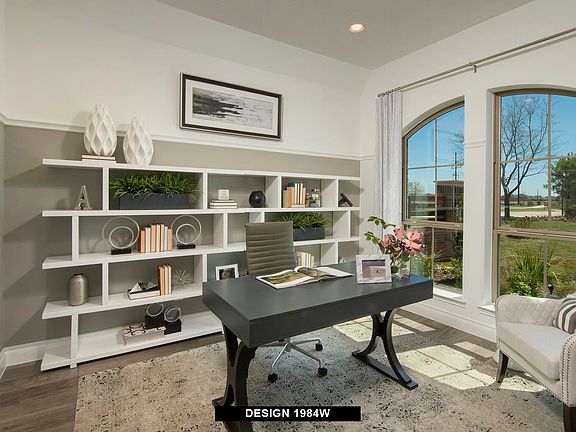 Home office with French doors set at entry with 11-foot ceiling. Open kitchen offers center island and corner walk-in pantry. Dining area opens to spacious family room with wall of windows. Private primary suite includes bedroom with wall of windows. Dual vanity, corner garden tub, separate glass-enclosed shower and large walk-in closet in primary bath. Abundant closet space and natural light throughout. Covered backyard patio. Mud room off two-car garage.
