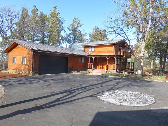 Peace and tranquility await you up Daffodil Lane. Wonderful Lindal Cedar Chalet home on 4.8 acres of mature oaks and pines. Built from solid western red cedar logs. Spring is the ultimate time to enjoy the hundreds of daffodils throughout the landscaped yard and up the paved drive. This 3 bedroom, 2 bath, 1655 sf home offers an open floor plan, covered front porch opens to tiled entry. Large living area with solid chalet wall of windows, allowing natural light bringing in a warm and cozy feeling. Knotty pine lined ceilings and walls enhance the overall warmth of home. Stunning lava rock and black slate hearth with wood stove is a focal point for the home. The kitchen features granite tile counters, electric range, also plumbed for gas, built in microwave, dishwasher and bar counter. Slider opens to full length redwood back deck. Large walk-in pantry/storage, plumbed with hot/ cold water and septic outlet. There are two bedrooms and one bath on main floor. The owner's suite is on the second level and is open to below, with vaulted knotty pine ceiling and slider to private balcony. Cedar lined walk-in closet, bath with large shower. The 2-car garage is heated, insulated and sheet rocked with concrete floor. Laundry area, storage cabinets along with work bench. Automatic garage door with remote.