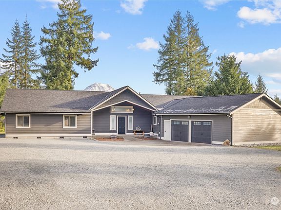 If a picture is worth a thousand words, then this view is worth a million. Welcome home to your modern rambler, where you'll find peaceful country living paired with luxury finishes. Breathtaking views of Mt Rainier & the Puyallup River valley from nearly every window. Spacious open concept home has been extensively renovated inside and out- far better than new! Modern farmhouse dream kitchen feat. quartz counters w/ 9' waterfall island, pot filler, Café appliances, custom range hood & walk-in pantry. Luxury primary w/ custom ensuite- soaking tub & walk-in tile shower. New roof, gutters, siding, plumbing, flooring, HVAC + too many upgrades to list! Private community river access, clubhouse, parks, trails. Must see this dream home in person!