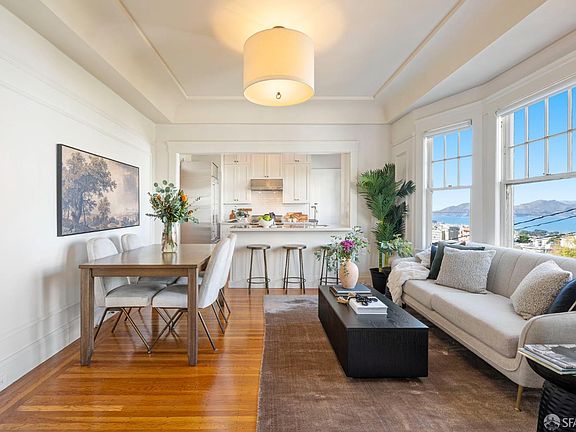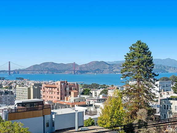 Perched in the heart of Russian Hill, this elegant and bright corner condominium showcases sweeping Golden Gate Bridge, Bay & Marin Headlands views. The generously scaled and grand floor plan offers ultimately flexibility, ideal for today's lifestyle. The spacious, sunlit living room with corner windows and French doors showcase beautiful bay views and a dramatic open floor plan leading directly to your gorgeous kitchen. Capturing timeless San Francisco charm with a sophisticated modern edge, classic period details include high ceilings, hardwood floors and crown molding blending seamlessly with contemporary upgrades, including a remodeled chef's kitchen with marble counters, breakfast counter, Wolf range, and Sub-Zero refrigerator. An updated subway tiled bathroom, two walk-in closets, and multiple other closet options throughout this spacious home. Additional features include 1 car side-by-side garage parking and elevator access directly to your front door within this gorgeous Edwardian boutique building. Just steps to Polk and Hyde Street's restaurants, cafes & nightlife, Francisco Park & Tennis courts, and close proximity to everything you need. Boasting a 97 Walk Score, this residence offers an unbeatable combination of history, luxury, and location. Welcome home.