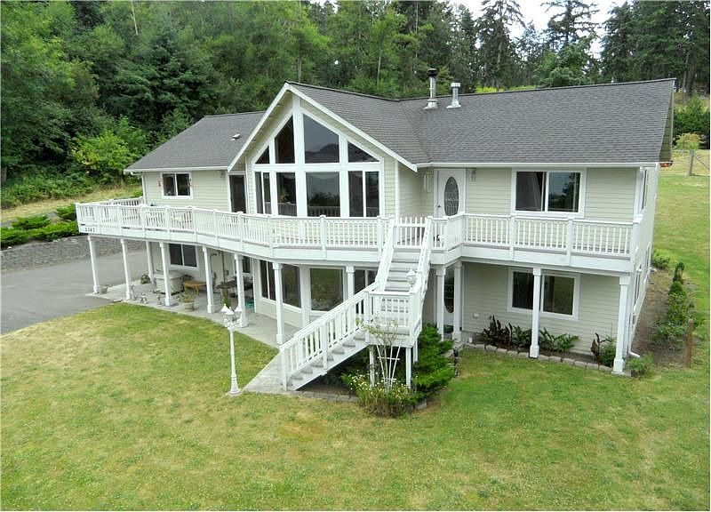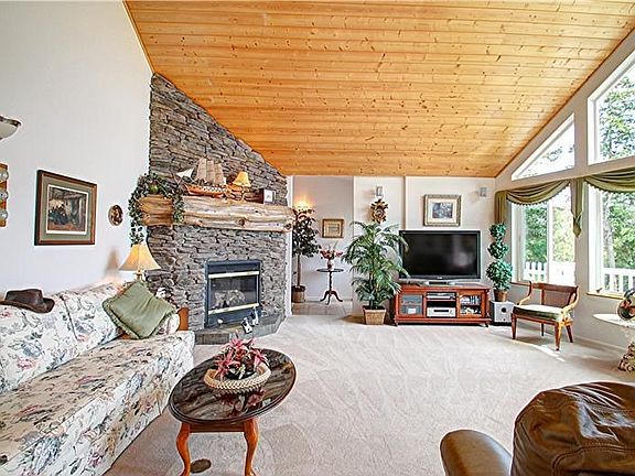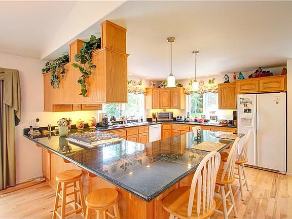 SPECTACULAR views & tons of windows to view it from in this 2623 sq ft home built in 2004. Parklike setting,5.12 acre,fully fenced w/comm boat launch & dock. Main flr has 2 bedrms,2 full baths. Mst 5 pc master en suite- jetted tub&huge walk-in closet. Kitchen has upper end appliances & cabinets,lrg w-i pantry,granite counter top & hardwood flrs.Living rm has rock fp w/gas insert. Downstairs are 2 bedrooms,full bathroom,family room w/ wood stove. 2 car attached garage w/mech/storage rm+2 car det.