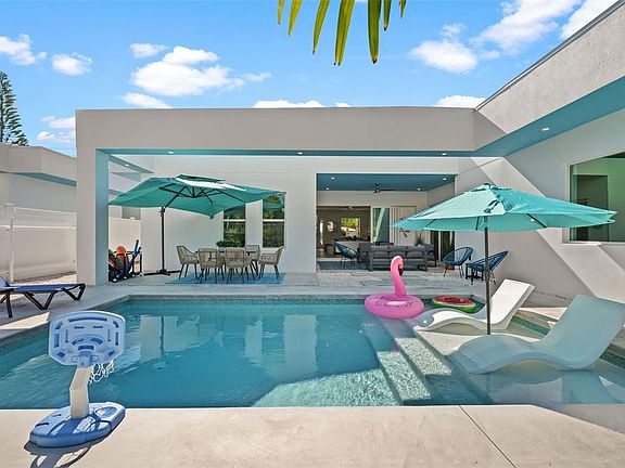 Please contact the Listing Agent to obtain details about the WEEKLY and MONTHLY rates. Available Dates in 2025: From November 20 to December 10, 2025; From December 30, 2025, to January 10, 2026; Available Dates in 2026: From February 19 to March 5, 2026; From March 15 to March 25, 2026; From April 1 to April 15, 2026; OR Long-term starting May 1, 2026 Should you wish to rent TWO LUXURY RESIDENCES for a larger gathering of guests (up to 18), consider our alternative property named "SunShine Sarasota" (2375 Waldemere St, Sarasota), located next to "Sky Blue Sarasota" (2365 Waldemere St). Experience unparalleled luxury in this breathtaking new construction Mid Century Modern Residence! Welcome to this newly constructed masterpiece in the highly sought-after Arlington Park neighborhood. This stunning 4-bedroom, 3-bathroom home encompasses over 2,300 sq. ft. of flawless living space, crafted for both practicality and memorable family gatherings. Immerse yourself in the pinnacle of upscale living in this newly built masterpiece, ideally positioned near Siesta Key and the lively core of Downtown Sarasota. This remarkable home presents a perfect fusion of sophistication and comfort, tailored for those who appreciate a luxurious yet cozy lifestyle. Enter your personal haven where a private, heated swimming pool creates a resort-style atmosphere that encourages relaxation and leisure. The beautifully crafted outdoor area offers picturesque settings for enjoying the warm Florida breezes. The interior of the home exemplifies refined living with an open-plan layout that facilitates a seamless transition between the living, dining, and kitchen spaces. The residence is embellished with opulent features, including tiles, fixtures, and contemporary cabinets, adding a hint of European elegance to the environment. Conveniently situated near the shops and dining options of Southside Village and just minutes away from the vibrant downtown area, Marina Jack, St. Armands Circle, and the famous Siesta and Lido beaches, this home provides both luxury and accessibility. The property boasts a stunning FULLY FENCED private backyard with a heated pool, surrounded by lush palm trees.