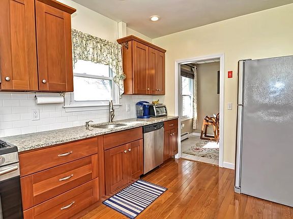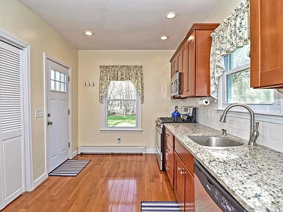 Opportunity knocks at 2365 Washington Street in Holliston. This cozy ranch style bungalow is move in ready, and is very conveniently located to shopping, major routes and Adams Street Conservation Area. Both the driveway and the 2 car detached garage are located on Adams Street. Cute updated kitchen (2013) features wood flooring, granite countertops, recessed lighting, gas cooking and stackable washer/dryer which are included. The dining area is light and bright, with ceramic tile flooring and room for a large table. The living room carpet is brand new (2016), and there are oversized windows in this room, allowing the sunlight to stream in. The front room offers many possibilities, and has pretty wainscoting. Both bedrooms have carpeting and built-in closet storage. Updated bath (2008( with tiled floor and tiled tub/shower. Other updates include newer windows, roof (2009); new front and side entry steps, new porch railing, and new driveway. Wonderful value for Holliston!