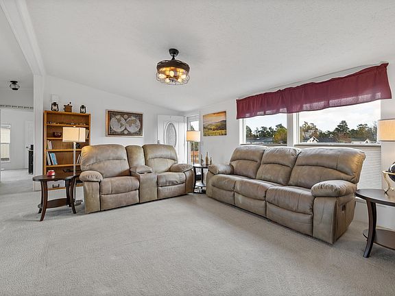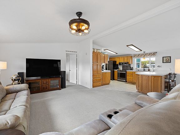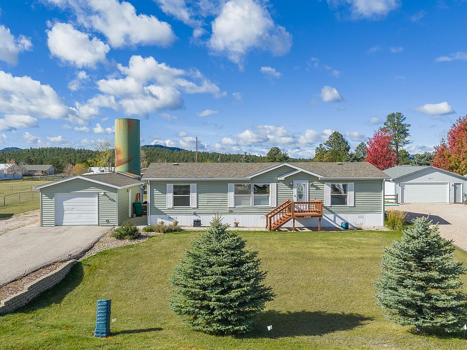 Listed by Pete Jensen, KWBH, 605-484-6713. Affordable home ownership is here- main level living made easy in this move in ready manufactured home on a permanent foundation! *Built in 2000, this home offers 3 bedrooms, 2 bathrooms and 1,352sqft *Open concept living space in the center with sleeping quarters on either end of the home *Large living room with subtle vaulted ceilings and a picture window that overlooks the neighborhood *Oversized kitchen with tons of cabinet and counterspace, and a large breakfast bar for seating and storage *2 bedrooms and 1 bathroom on one end of the home, great for family or guests *Primary bedroom on other end of the home for privacy, with walk in closets and private access to the home's second bathroom *Convenient laundry area with storage space and a door to the back yard *Slider door from the dining room onto the large west facing deck that has views of the Black Hills *Flat interior lot at the back of the neighborhood and has an oversized detached garage for secured parking, and a shed for outdoor storage *Large front deck as well- great for your morning cup of coffee watching the sunrise. *Centrally located between Rapid City and all the Black Hills has to offer- call today! **Home has a whole house gas generator with built in transfer switch for private electrical panel. Central Air system is only 2 years old