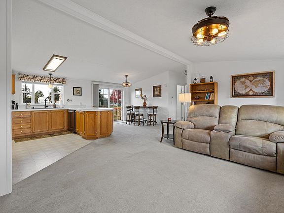 Picture windowLarge breakfast barShed for outdoor storageFlat interior lotOversized detached garageVaulted ceilingsLarge west facing deck