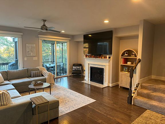 Open, bright layout with hardwood floors and a spacious kitchen featuring granite countertops, stainless steel appliances, gas cooking, and a large island. The screened-in deck overlooking the trees creates a perfect morning coffee or evening unwind space.