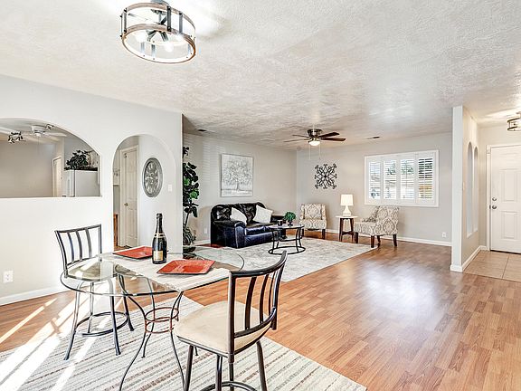 Adorable and Affordable! Nice CLEAN one level home with BACKYARD ACCESS and RV PAD! Spacious and open floor plan with laminate and tile floors, NO CARPET! Fresh neutral paint completed in 2023, newer shutters on windows, both toilets replaced (2023), pitched metal roof, refrigerated air! Primary bedroom has a generous walk in closet. HUGE yard with covered patio. Oversized garage has a wok shop area. All appliances convey. Super neighborhood with walking paths and parks in the heart of Rio Rancho with many shopping and dining options nearby!