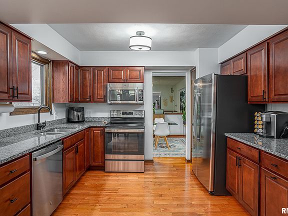 Lovely and well-cared for 4-bedroom home in Bettendorf School District! This home is on a cul-de-sac, with open living-kitchen concept and large yard. The main floor features hardwood floors in the remodeled kitchen, with new stainless appliances, pantry, and granite counters. The kitchen has an informal dining area, which is open to the great room with a fireplace. There is also a formal living room (being used as an office) and formal dining room. All bathrooms have been remodeled and refreshed. Upstairs there are 3 large bedrooms. The primary suite has two large closets and a beautifully updated bathroom suite. The walkout basement is finished with a 4th, non-conforming bedroom, rec room and laundry, with plenty of storage as well. The deck is accessible off the kitchen and overlooks the large, fenced-in yard.