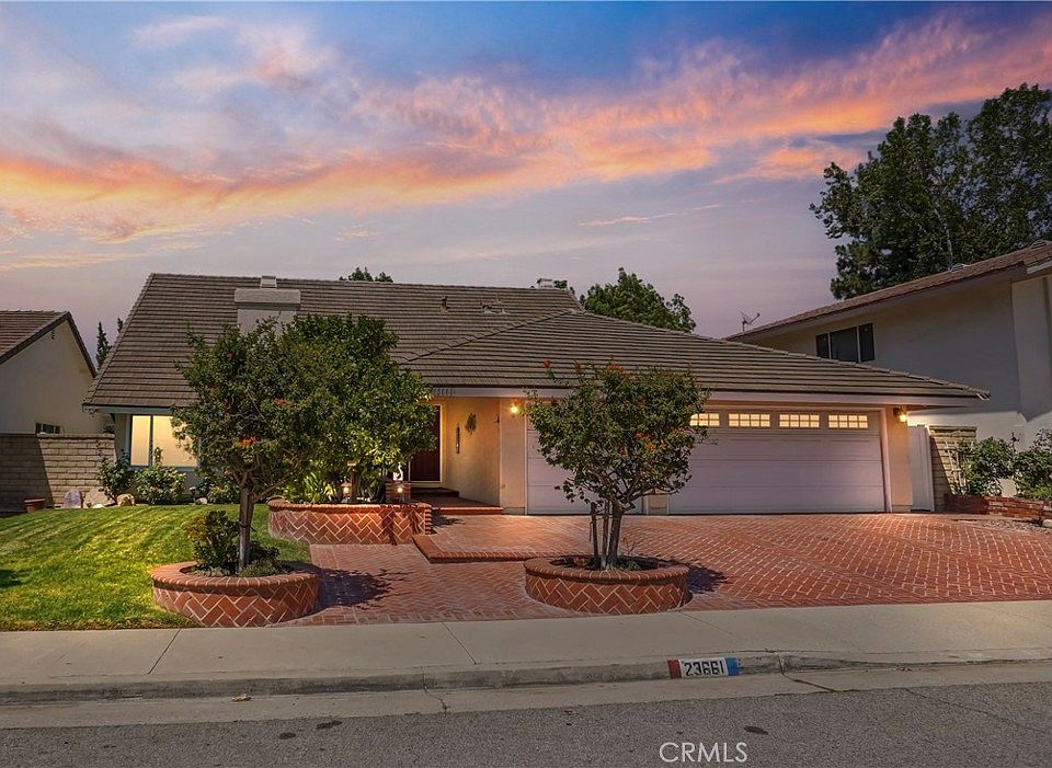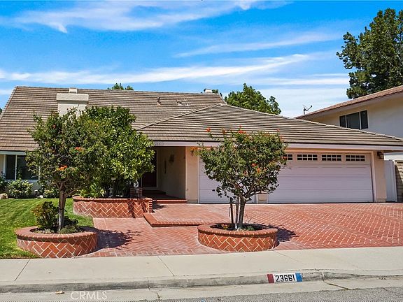 Welcome to this charming ready to move-in 5 bedroom, 3 bath, 3 car garage, turnkey home located near the Valencia paseos in the highly desirable Old Orchard 1 neighborhood. The custom brick hardscape leads to the double door entryway and continues to the tile foyer and expansive living room and formal dining area. The kitchen and family room area are beautifully framed by custom glass French doors. The kitchen boasts a long granite peninsula, granite countertops, lots of additional cabinet storage space as well as pass-through windows near the sink for indoor-outdoor entertaining in the park-like rear yard. The home's beautiful brick hardscape in the front, back and side yards with fully enclosed block walls adds to the home's security and privacy too. The large family room area includes a custom gas fireplace, full size windows along with sliding glass doors which bring in tons of natural light from the landscaped rear yard. Adjacent to the family room is the private oversized bedroom with sliding door access to the rear yard with its own private brick patio area and to the downstairs bathroom with a full size walk-in shower. Upstairs hosts 4 more bedrooms including the master suite with cedar lined closets, high ceilings and privacy throughout. The ensuite master bathroom is custom built with tile from floor to ceiling including a secluded jacuzzi tub and multiple shower head tub shower combination. The home is also equipped with double pane, energy efficient windows and sliders throughout, a smart thermostat system along with wall to wall cabinet storage in the 3+ car garage which includes a small bench/work area near the laundry. Accompanying this quiet and peaceful neighborhood is access to the paseos at the end of the cul-de-sac. The location is also ideal being close to shopping, restaurants, grocery stores and easy freeway access. The community itself also has many amenities such as parks, play areas, a pool, spa, club house, BBQ and picnic areas and is walking distance from the California Distinguished award winning Old Orchard School and to Hart High School with no Mello Roos and a low HOA, making this home ideal for anyone looking for a neighborhood with so much to offer.