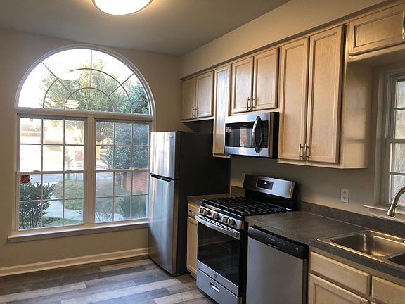 Mint condition end unit townhome with 1st floor primary bedroom with vaulted ceiling & double closet, Primary bath with jetted tub + shower, double vanity sinks, Large Great Room with gas fireplace, built -in bookcase, newer luxury vinyl flooring, newer carpet, new padding, new light fixtures and newer ceiling fans, large dining area, huge eat-in kitchen with brand newer stainless steel appliances including gas stove, one car garage with newly painted custom floor so great for gym if you don't park in the garage, two large bedrooms upstairs with jack and jill bathroom with tub and separate shower, utility closet with room for full size washer and dryer, 1/2 bath with new toilet & newer vanity, newer back door, covered front porch, concrete patio, spacious yard. Excellent location... Available November 1, 2025.