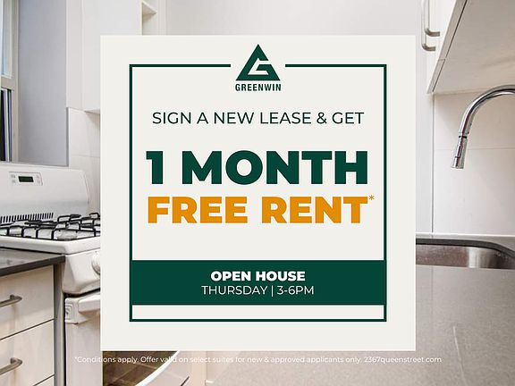 Get 1 month free on new leases signed before October 1st, 2024. On select suites for a limited time.AboutDiscover coastal living at its finest at 2367 Queen St. E., situated in the heart of the Beaches, Toronto. This low-rise gem is located on the south side of Queen St. E., offering residents easy access to the scenic Lake Ontario and the vibrant Boardwalk. With the Queen St. E. streetcar just minutes away, commuting to downtown Toronto is a breeze, and an array of shopping, fine dining, and grocery options are within easy reach. Our spacious studio suites boast stylish refinished hardwood flooring in the living areas and stone-like ceramic tiles in the kitchens. The kitchens are designed with elegant white cabinetry, self-closing drawers, and feature four stainless-steel appliances, making them as functional as they are beautiful. Experience the perfect blend of comfort, convenience, and coastal charm at 2367 Queen St. E.Community AmenitiesLaundry facilitiesConvenience storePublic transitShopping nearbyParks nearbyBeach nearbySchools nearbyControlled EntryQuiet NeighborhoodProfessional ManagementParking AvailableMyGreenwin AvailableClose to TTCSuite AmenitiesFridgeStoveDishwasher availableMicrowaveHydro - ExtraStainless steel appliancesUpgraded KitchenUpgraded WashroomUtilities IncludedHeat
