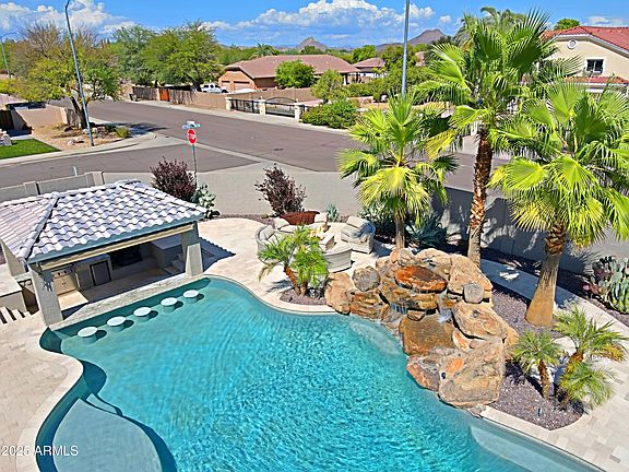 The glow up is real! Exceptional, luxurious and seamless blending of indoor/outdoor living with panoramic sliding doors, inviting you to enjoy the outdoor resort style oasis. Stunning waterfall flows into heated diving pool with swim up bar to outdoor kitchen pavilion. Entertainment continues indoors: Gathering room has custom bar with kegerator, seating 10. The spacious kitchen has a 6-burner gas range, marble counters, oversized island seats 4 and overlooks family room with fireplace. Relax in the primary bedroom with sitting area & fireplace. Primary bath features immersive walk-in shower, freestanding soaking tub & sizable custom closet. En suite guest room is perfect for long term guests. 3 additional bedrooms & all baths upgraded. See features list for details on this masterpiece.