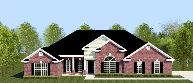 The Richland Manor 16 Easy Living floor plan offers 3315 square feet, timeless charm and flexible comfort in a spacious single-story ranch design. With four bedrooms and three and a half bathrooms, this open and split floor plan balances elegant gathering spaces with quiet retreats. A wide front porch sets a welcoming tone, while the large back porch invites relaxed outdoor living.