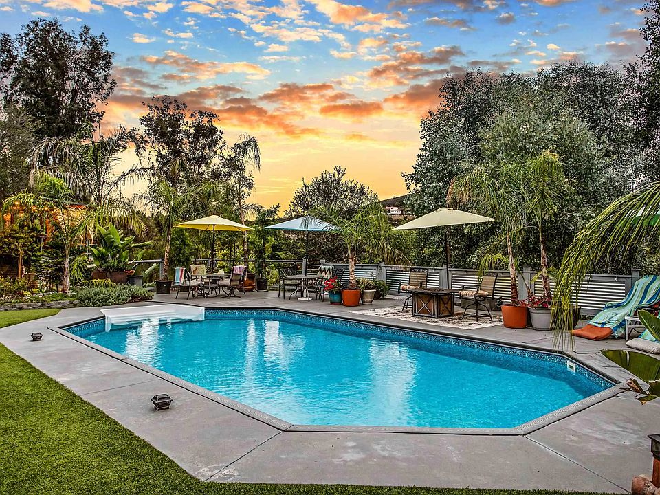 It’s as unique as you are—your own private, tropical retreat nestled in the foothills with stunning views of hawks circling the treetops. It’s calm, quiet, and tucked away from it all in Palo Verde Ranch—yet you're just minutes from stores and restaurants. This jaw-dropping custom home is a rare, one-of-a-kind find. An artful 25 foot high waterfall cascades down as you approach the front door and flows under a bridge—each time you walk across it, you slow down and breathe a little deeper. The spectacular soaring glass foyer welcomes you in. Floor to ceiling windows flood the sprawling living/dining area with natural light, and the warm honey-toned high vaulted ceilings give a golden glow. A dramatic 20 foot high stacked stone fireplace anchors the space. The updated open-concept kitchen and den—with its stacked stone wall, fireplace, and granite hearth exude comfort and ease. Real hardwood floors, custom details, and thoughtful design give this home its uncommon blend of elegance, warmth, and character. All three bedrooms boast the rich, honey-colored vaulted wood ceilings. The serene primary has a spacious walk in closet and a high deck with views. There are two and a half bathrooms, plus a bonus space—ideal for a home office, guest area, or creative studio. All rooms except one connect to the outdoors through large sliders, and each of four decks offers a different view of the trees, boulders, and mountains. A breezy 27x27 covered deck adds even more outdoor living space for dining, entertaining, and spectacular sunsets. You also get owned solar, zoned AC plus a bedroom unit, a two-car garage with half bath and laundry, two carports, a 16x12 detached workshop, and ample parking space. The sparkling salt water pool with its giant Trex deck, gazebo, and carefree turf is perfect for relaxing. With 107 queen palms waving gracefully in the near-constant gentle breeze, 40 giant bird of paradise, and multi-colored flowers, visitors ask if this is a resort. The landscaping conserves water, doesn’t require mowing, blends with nature, and is lit with solar lights. Massage your worries and aches away in the chlorine-free 30-jet hot tub, visited by hummingbirds, owls, and doves. Equestrians and hikers appreciate the miles of trails right out the door. The barn can be used for horses or storage. Walk one block to a gorgeous lake, tennis/pickleball courts, a horse arena, and picnic pavilion set amongst picturesque ancient oaks, giant boulders, and trails with views of the Cuyamaca Mountains beyond. As part of the Palo Verde Ranch community, you also enjoy a clubhouse, gym, another park with a larger lake, sand beach, and lush lawn, a boat dock (electric boats only,) fishing, huge picnic pavilion, fun events, and more. This kind of property rarely comes along—peaceful, private, and unique character, all in a well-established, friendly community with top-notch amenities yet unbelievably low dues. If you’ve been looking for a home that feels like being on year-round holiday, this might be the one.