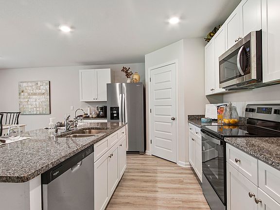 The interior features of this home include EVP flooring in the main living areas and bathrooms and carpet in each bedroom. The kitchen is well appointed with a large center island, granite countertops and beautiful white cabinetry. Prep and clean up from all your meals with ease from your center island that has a sink and dishwasher. Additional appliances include a smooth top stove and microwave. A Smart Home Technology package is included with a Qolsys IQ Touch panel, a DEAK0 Smart Switch and smart thermostat and KwikSet Keyless entry