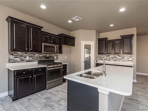 Beautifully built brand new home situated on a corner lot located in the Mountain View Estates! This property features incredible views of the Hualapai Mountains! Other important features for this home includes: *1,880 sq ft *Stone accent fronts *Two tone exterior paint *Front landscaping *Covered patio *5" Baseboards *Quartz counters *Open floor plan *Tile floors *36" interior doors *Glass backsplash *Kitchen pantry *Indoor laundry *Soft water loop *Custom master bathroom with dual sinks, dual vanities and walk-in shower *Tile showers *Walk-in closets *8' garage doors *3 car finished/insulated garage *RV Parking with gates *Block wall fencing *14 Seer A/C.