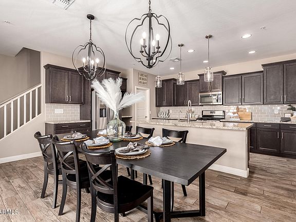 Welcome to this POOL home in the Master Planned Community of Verrado, with 'A' Rated Schools, 78+ parks, 20+ hiking & biking paths, 3 community pools, fitness center, shopping, dinning & 2 championship golf courses! This home is on one of Verrado's quiet tree lined streets. First floor master with en suite & a second floor master as well with a soaking tub. This open concept floor plan has a beautiful kitchen with stainless steel appliances, subway tile backsplash, & large island. Plantation shutters throughout & 3 TVs included! Second floor has a large loft for extra living space, second floor laundry & additional bedrooms. Spacious side yard with a pool & water feature, pergola for shade & decking. Low maintenance yard plus a 3 car garage with built-in custom cabinets!
