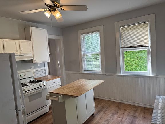 Updated, refreshed kitchen with new butcherblock countertops, white cabinets, new sink and faucet, new 5 burner gas stove, new dishwasher, 1 year old fridge.