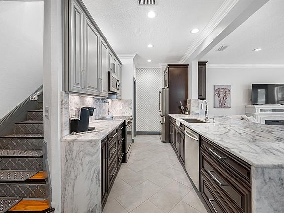 Welcome to your new Luxury Dream Townhome in the heart of the Historic Old Northeast and located in a NON-FLOOD ZONE. Just under 1400sf, this two-story, totally updated Townhome boasts a Primary suite with ensuite bath & Walk-in Closet upstairs along with 2 additional bedrooms, a second full bath, laundry closet, a built-in marble folding station and a linen closet. There is another half bath downstairs which is perfect for entertaining. The open concept Gourmet kitchen, living room, and dining area make this an entertainer's dream layout. 10' ceilings and 9' Doors! The gourmet kitchen has abundant work space and storage with a beautiful 14.5' x 4.5' Carrera Italian marble waterfall island, matching marble countertops and backsplash with a pot filler feature for the stove, all Stainless Appliances, and a large walk-in pantry. All 3 bathrooms are exquisite with floor to ceiling marble. Both full baths have beautiful large glass and marble walk-in showers. The primary bedroom has a walk-in closet and a small private balcony w/sliding glass doors overlooking the gated central courtyard. The townhome includes a private, ground level, outdoor patio for grilling and chilling, accessed from the beautiful 9' French doors in the living area, an exterior front porch patio, and a detached one car private garage w/remote accessible from the alley. The ground floor has new ceramic tile and 2nd story is beautiful maple hardwoods. Large Crown molding throughout is just one of the many luxury details to describe as well as new fresh, white paint! Nest thermostat installed with mobile app access for convenience along with all key free door access keypads. Roof was recoated last year and under warranty. New irrigation system installed in 2025 for the gorgeous landscaping. Don't miss this amazing opportunity to be in the "heart" of all the action in St Petersburg. Walkable within 3 blocks to Beach Drive, The Vinoy, The Pier and Parks, shopping, bars, restaurants, not to mention all the 4th St amenities. Minutes to I-275 and a short commute to south Tampa and both Airports. HOA dues only $500 monthly, no assessments and NO FLOOD ZONE! Insurance is only $1200 yearly with current carrier. This is one of only 4 units in this small boutique complex. All are owner occupied. The unit is super energy efficient and total electric. You will not find a better location, price point or lower HOA dues than this - anywhere in the city! Come see your move in ready new slice of Heaven in St Pete! $799k. Designer owned and Designer furnishings are available for separate purchase.