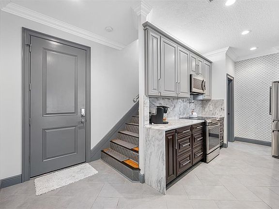 Private balconyFront porch patioMarble countertops and backsplashLarge crown moldingStainless appliancesLarge walk-in pantry