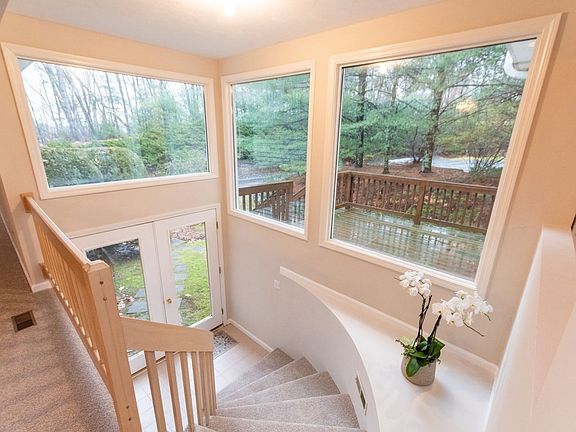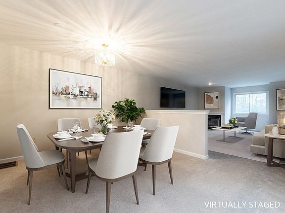 Introducing this 3 level, turn-key ready, townhouse nestled away in a quiet neighborhood. Just shy of 2000 ft.² of living space & filled with natural sunlight: new carpeting & paint throughout the entire unit. First level offers an eat-in kitchen with peninsula countertop seating & additional table space, formal dining room, & living room with a wood burning fireplace. Two total bedrooms, the primary includes a second fireplace, luxurious bathroom (shower stall, double vanity, & tub). Second bedroom offers an en suite bathroom & plenty of closet space. 2 car garage tandem style & additional off-street parking. Lower level is unfinished but ready to be easily converted into additional living space, perfect for a home office, playroom, etc! Laundry is conveniently located in this bonus space. Central A/C by forced air (two zones: heating/cooling) & a new hot water tank was installed. Private outdoor deck. Close to major highways, public transportation, restaurants/shopping, & more!