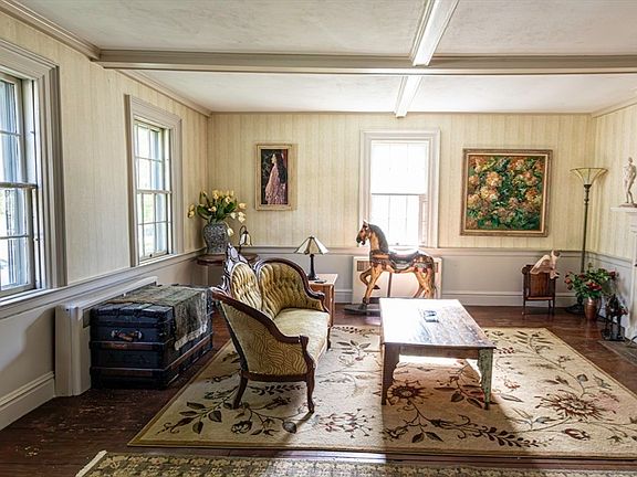 Stately Federal-style Antique Colonial with hipped roof set on lovely corner lot with a three story barn. This historic home offers timeless charm featuring 8 fireplaces, wide plank floors and beamed ceilings. First floor has updated eat-in kitchen with open shelving, granite counters, fireplace and stainless steel appliances, elegant living room with fireplace, dining room with french doors, built-ins and fireplace, separate wing with 2nd efficiency kitchen, bedroom with fireplace and bathroom. Second floor has 3 spacious bedrooms, all with fireplaces and full bath with shower stall and jacuzzi tub. Enjoy the outdoors with brick patio, deck and beautiful gardens. Partially finished barn ideal for certain in home businesses or possible conversion to an accessory dwelling. Recent updates include a new roof(2021), exterior of house painted(2023), new gutters (2023) and barn exterior walls repaired and siding replaced(2022). Abuts the Rail trail!