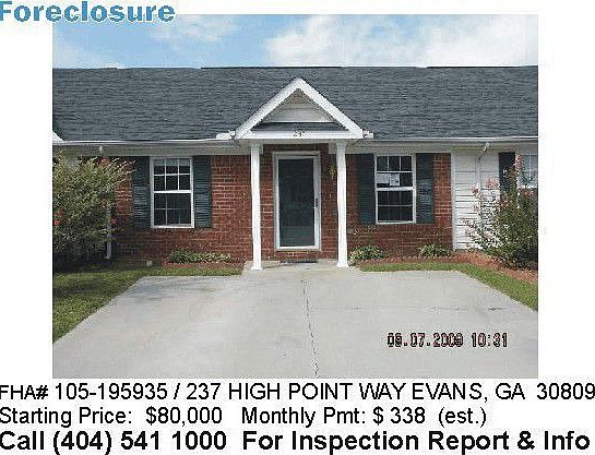 CHARMING ONE FAMILY HOME IN AUGUSTA, GA! THIS HOME HAS 2 BEDROOMS AND 2 BATHROOMS! GREAT FAMILY HOME! This is a HUD property (see HUD number above). This property can be purchased with 3% down with less than perfect credit. Any repairs needed, can be put into the loan amount. Call Robert for details. TOLL FREE: 866-731-6529.For a complete list of HUD properties, go to www.hudusa.info