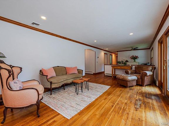 A charming expanded ranch provides all the space and comfort you desire. The main living areas and all three bedrooms are highlighted by beautiful hardwood floors. Every room in the home features distinctive crown and baseboard moldings, adding character throughout. The kitchen boasts white cabinets, a tiled backsplash, and stainless steel appliances. With ample cabinet storage and counter space, it is a highly functional kitchen. The living area is bright, featuring large sliding glass doors that open to the back deck. The stunning great room is spacious, with vaulted ceilings, recessed lighting, and a focal wall adorned with decorative moldings and a stone-surround fireplace. Its generous size allows for a variety of configurations and uses. The primary bedroom is well-sized and includes a large ensuite bathroom. The oversized shower is fully tiled, and there is abundant cabinetry for storage.