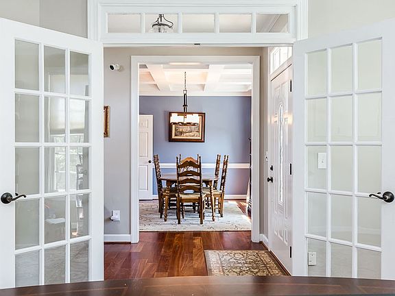 Elegant coffered ceiling dining room and french-door study with charming bay window