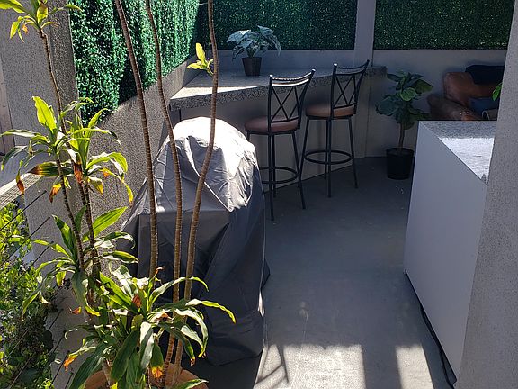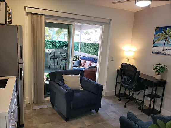 The Apartment includes a Private Outdoor Living Room Covered Porch Patio with BBQ, small refrigerator and corner Island. The Indoor Living Room has nice sofa, recliner, desk/chair and 55" TV. The Bedroom has Cal King bed, closet with shelves and a 50" TV. The Apartment has a beautiful new small Kitchen with brand new stainless steel appliances, glass burners, large air fryer/toaster Oven. There is also a brand new Bathroom with a new corner shower and a Washer & Dryer, etc.
