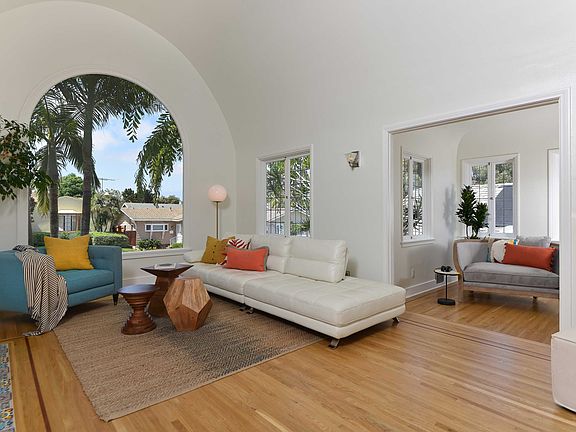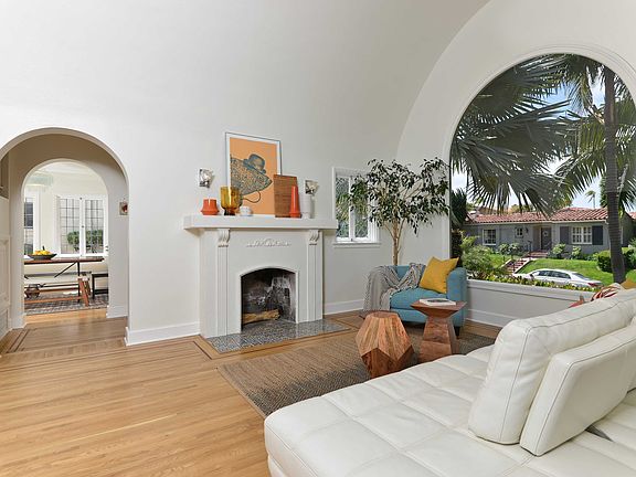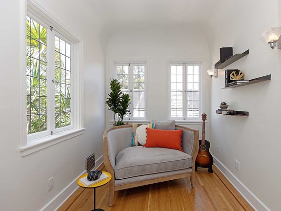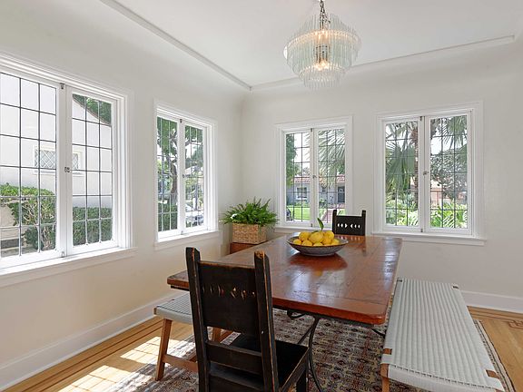 Charming Tudor-styled home presents a transformed interior. Dramatic living room features inlaid wood floors, vaulted barrel ceiling, arched window and fireplace. Framed by leaded glass windows, light-filled dining room opens to designer kitchen, which leads to enchanting patio complete with spa, waterfall fountain and bbq. Functional floor plan features spacious family room, home office and downstairs master suite with luxurious bath. Private balcony terraces overlook lush courtyard and enjoy bay views.