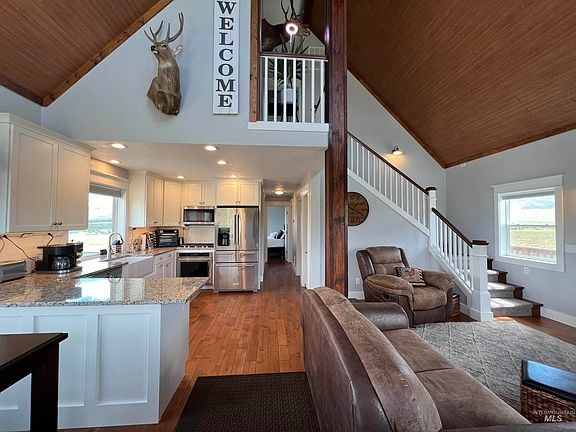 Furnished home on 10 acres in the country surrounded by Mountain View’s. Make it your family home or Airbnb with plenty of room. Enjoy beautiful sunset’s while you sit in your new hot tub on the wrap around porch.This spacious 2800+sq ft home includes 5 bedrooms & 3 full bathrooms. The master bedroom & bathroom upstairs gives you views that will make you not want to leave while the big windows let in lots of natural sunlight. In the master bathroom you will find duel vanities with lots of cabinet space, a custom shower, heated floors & a claw foot tub. The main floor includes two bedrooms, laundry room, kitchen with granite counter tops, dining room and living room. Head downstairs to the daylight basement with a large family room, two more bedrooms and another full bathroom. The separate entrance would allow your extra guests to come stay and have the whole space to themselves. Detached 40x40 barn/garage with a loft. An additional 19.33 acres is available.