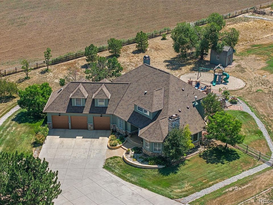 Where 2.5 acres of freedom meets stunning mountain views. This custom two-story dream in Nikkel Estates blends privacy, scale, and style—no HOA, A-1(A) zoning, and room for everything you love. Inside, nearly 4,800 finished sqft offers a versatile layout with 5 bedrooms and 5 baths for effortless everyday living and entertaining. The updated gourmet kitchen delivers granite counters, a gas range and double ovens, hidden walk-in pantry, and direct access to the covered patio. The upper-level primary retreat is a wow—private balcony with unobstructed mountain views and a spa-level five-piece bath with steam shower, jetted soaking tub, and an oversized cedar walk-in closet. Downstairs, the finished basement opens endless possibilities: a full second kitchen/wet bar, media/games area, sauna and mirrored gym space—ideal for multigenerational living, guests, or an at-home wellness zone. Car people and creatives, this is your canvas: 8 garage spaces total—3-car attached (with a studio and powder room) plus a 5-bay outbuilding—plus a circular drive and RV-friendly features. Step outside to Colorado living at its best: covered patio, Chiminea fire pit, private sprawling land for chickens or goats, and existing pickleball & volleyball courts—with space left to dream bigger. Roof is ~3 years young and hail-rated for peace of mind. All of it sits on 2.5 fully fenced, irrigated acres with meadow and mountain vistas, horses allowed, and public + well water plus septic—real, usable land that works for today’s lifestyle without any restrictions. Moments to Adams 12 schools (Meridian, Rocky Top, Legacy), open-space trails, and quick routes to Denver or Boulder—quiet country feel with city convenience. Link to video: https://www.youtube.com/watch?v=fktRL70ZRD4