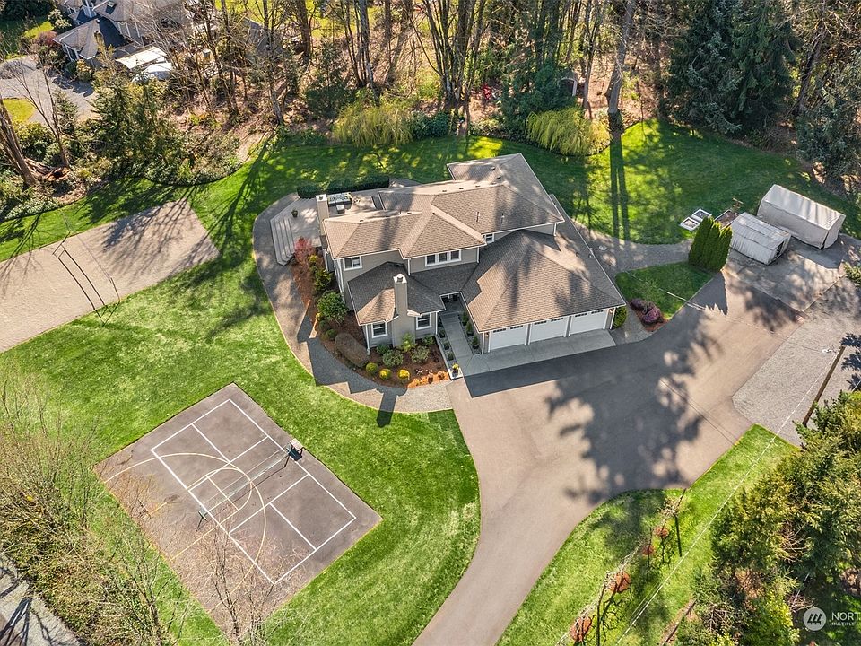 Peace & Tranquility on 3.4 Acres adjacent to North Creek! This 4 bed, 2.5 bath rare gem has over 3,000 SF of living space, an expansive entertainment deck, sand volleyball pit, pickleball court, fire-pit and private nature trails that lead to the serene North Creek to unwind and take in the sounds of nature. Newly carpeted and repainted inside and out, the main floor includes a 2-story entry, formal living room, gourmet kitchen with dining area, spacious light-filled family room encased in windows and the lovely main floor primary en-suite. Upstairs you'll find 3 more bedrooms, loft and a full bath. Private and quiet yet just minutes to the Microsoft Connector, Burke Gilman Trail, Downtown Woodinville, and in the acclaimed North Shore SD.