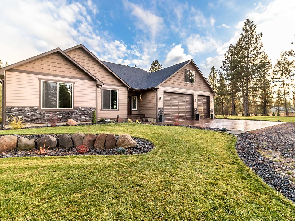 Gorgeous open-concept rancher on 10 acres, built in 2014. Great room with vaulted ceilings, huge windows with views of surrounding forest, and high-end engineered hardwood flooring. Custom kitchen with pantry. Granite counters and exquisite tilework throughout the entire home. Luxurious master suite with walk-in closet. Heated tile floor in spacious master bath. 520 square foot "bonus room" bedroom and bath above the 3-car attached garage. Also has an insulated 10' x 20' shop / detached garage with electric service. Close to EWU. 8 minutes to downtown Cheney, 20 minutes to downtown Spokane on I-90.