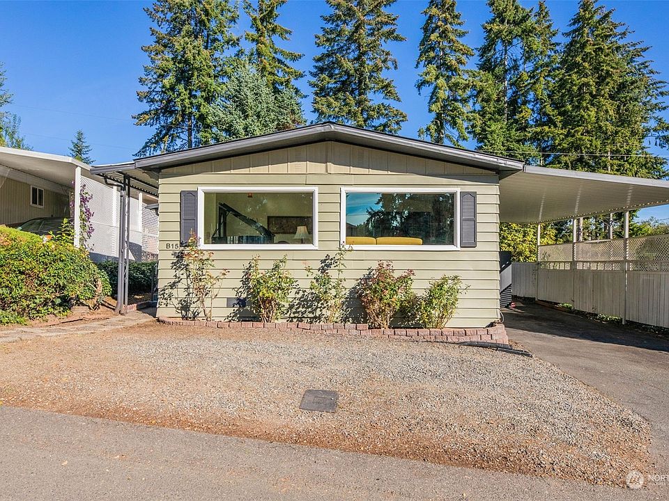 Rare, ALL-AGES Park conveniently located within minutes to Bothell, Kenmore and Lynnwood, as well as I-5 and I-405 for easy commuting! Brand new composition roof, double pane windows and exterior paint. Light and bright open concept living/dining room features vaulted ceilings, stone fireplace with insert and built-in hutch. Eat-in kitchen, with plenty of additional seating, opens to family room with access to covered porch area. Primary bedroom with new carpet and ensuite bathroom with linen closet. Lots of parking with large carport and gravel area out front. Two outbuildings for additional storage. Park offers tastefully updated community club house for residents to enjoy. Northshore school district too!