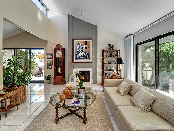 HUGH KAPTUR designed Saddlerock Gardens as an intimate twenty-four-unit complex in a PRIME SOUTH PALM SPRINGS location. Walk to Jensen's, ACE, and one of the many restaurants in Smoke Tree Shopping Center. Or, pull out of your TWO-CAR GARAGE and head east or west on Palm Canyon. TWO EN SUITE BEDROOMS, PLUS a third currently used as AN OFFICE, means you have room for guests and a place to work from home undisturbed. The spacious living room features a FIREPLACE and is bookended by a SOUTH-FACING PATIO and the dining area. A lovely kitchen, open to the dining area, completes this end of the home. At over 1,700 SQUARE FEET of living space, plus a garage, this elegant home is an incredible value. It is refined and shows as a pride of ownership. QUALITY DOUBLE-PANE WINDOWS THROUGHOUT, including the clerestory. INDOOR LAUNDRY. With an eastern-facing patio off the dining area and one more outdoor space off the primary suite, this condominium truly expands into THE FEEL OF A SINGLE-FAMILY DWELLING. Come, see this unique opportunity for yourself. Sit. Enjoy the mountain views. Imagine yourself sipping a morning cup of coffee or an evening glass of wine. LIFE CAN BE THIS GOOD.