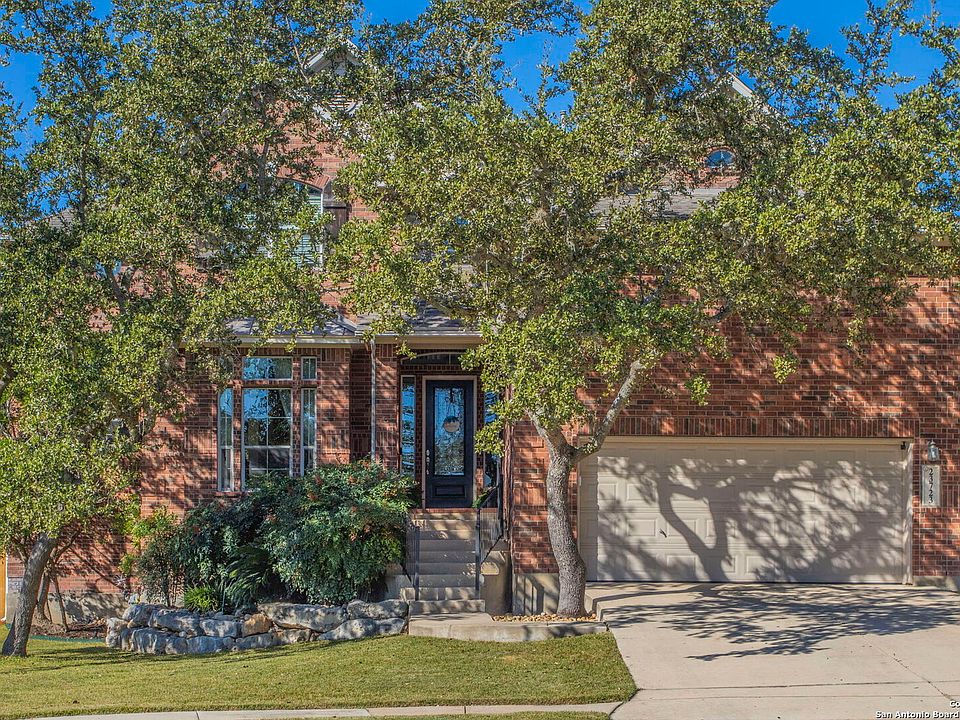 A lovely two-story home tucked away on a quiet cul-de-sac offers the perfect blend of comfort and natural beauty. It features 4 spacious bedrooms, 3.5 bathrooms, a dedicated office, and a large upstairs game room. The property offers a welcoming kitchen complete with a breakfast area, generous cabinet storage, and ample countertop space connected to a formal dining room. Additional highlights include tall ceilings, a double-sided fireplace, and a charming built-in home for your four-legged family members. Enjoy a covered patio with two ceiling fans and an attached wood deck that also provides for under-deck storage. The scenic backyard is an oasis for family and friends, with a pool, outdoor kitchen with wood-burning pizza oven, and multiple entertaining areas on a 0.4 acre lot featuring mature oak trees. The outdoor kitchen is equipped with a built-in Lion gas grill, Marvel refrigerator and kegerator, FireMagic double-sided burners, and power burner. Located in the Mountain Lodge community, residents enjoy access to top-rated schools, two pools, a playground, basketball courts, and the added benefit of no city taxes!