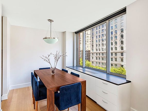 The renovated kitchen has white cabinetry, high end appliances and gorgeous countertops & backsplash. This corner living/dining area with rounded windows receives an abundant amount of sunlight and has views up and down the Broadway Mall.The Dining area also has the potential to be converted into a third bedroom as an added bonus to this most sought after line! The Master Bedroom has an ensuite renovated bathroom with limestone walk in shower and smartly added cabinets built into the wall for additional storage. This bedroom has generous outfitted closets including a walk in and hidden drawers for that sleek modern feel. The second bedroom is configured as an office by day and bedroom by night with the expertly designed murphy bed/couch built into the wall with custom shelving and closets. There is a built in desk in this room as well. Completely turnkey with new floors, new built-ins and window treatments.