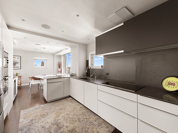 renovated and is a welcomed oasis after a busy day. The lower level boasts a white Poggenpohl kitchen with integrated Miele and Liebherr appliances, Subzero wine fridge, Wolf steamer and Caesarstone countertops. The third bedroom is on this level featuring an ensuite windowed bathroom with stall shower. The dining/living room is L shaped and is great for entertaining whether inside or off of the South facing, 250 square foot terrace with plenty of room for seating, planting herbs/flowers and taking in those glorious views. A windowed powder room, walk in pantry and a walk in closet, under staircase storage cleverly hiding the electronic and audio devices, completes this floor. One flight up and you are greeted by split bedrooms. Wake up in the primary bedroom with southwestern views of the river and downtown NYC. This king-sized room has an outfitted walk in closet, and an ensuite bath which feels like a spa with