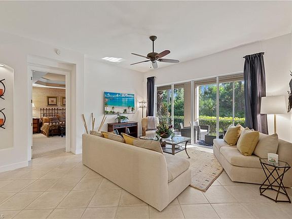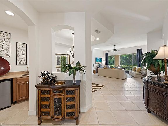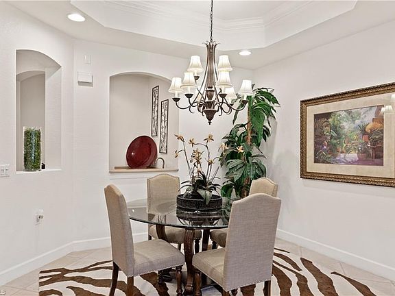 PRICED TO SELL! Step into this elegant 3 bedroom/2.5 bath home where paradise awaits you! The charming living and dining room is open and spacious accompanied by a wet bar perfect for entertaining. Large master suite is tastefully decorated with gorgeous grass cloth wall paper, classic furniture and boasts an oversized walk-in closet and new carpet. Master en-suite showcases a soaking tub, dual sinks and separate shower. Guests will feel welcome in the nicely appointed bedroom complete with en-suite and walk-in closet. Hardwood floors in 3rd bedroom/den, laundry room with utility sink and 2-car garage. Brand new electric storm shades on the lanai will provide protection and added security. This home is a must see. Merano has a new community pool and pavilion with a small fitness room and kitchen.