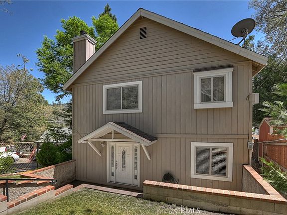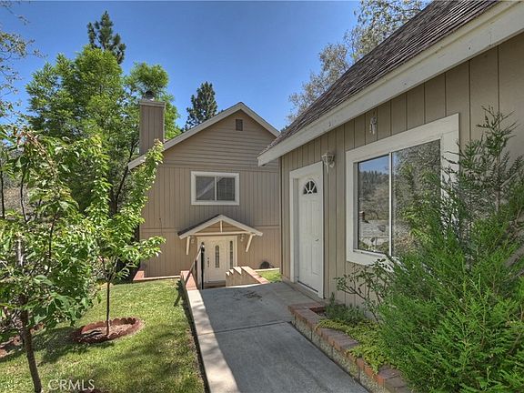 This Crestline Village home boasts many hard-to-find features and is competitively priced to sell. As you enter the gated area, you are greeted by a lush front yard adorned with fruit trees. A few steps lead down to the front door, flanked by two side panels, creating an impressive entrance.