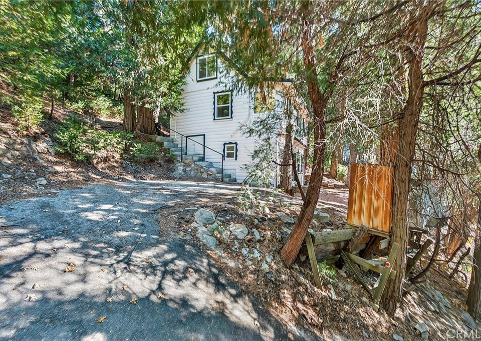 Discover mountain charm and modern comfort in this beautifully remodeled 3-bedroom, 2-bathroom cabin nestled in the heart of Crestline. This unique three-story “dollhouse” cabin offers a one-of-a-kind split-level design that blends character, functionality, and fun. Step inside to find a warm and inviting main floor featuring an updated kitchen including stainless appliances, quartz counters, and shaker cabinets The main floor also featuresan additional bedroom and full bathroom—perfect for guests or family and a cozy fireplace. Downstairs, you’ll find a spacious master suite occupying its own private level with its own exterior access, offering comfort and tranquility. Venture upstairs to the converted attic, where two charming bonus rooms await, accessed through a hidden stairway that adds a whimsical, storybook touch to the home. Each level provides its own sense of privacy and purpose, making this layout ideal for both relaxation and entertaining. Set on an above-average 13,600 sq. ft. lot, this property offers plenty of outdoor space for gatherings, gardening, or simply enjoying the peaceful mountain surroundings. Whether you’re looking for a cozy full-time residence, a weekend getaway, or a unique short-term rental, this remodeled Crestline retreat delivers a rare blend of charm, creativity, and comfort.