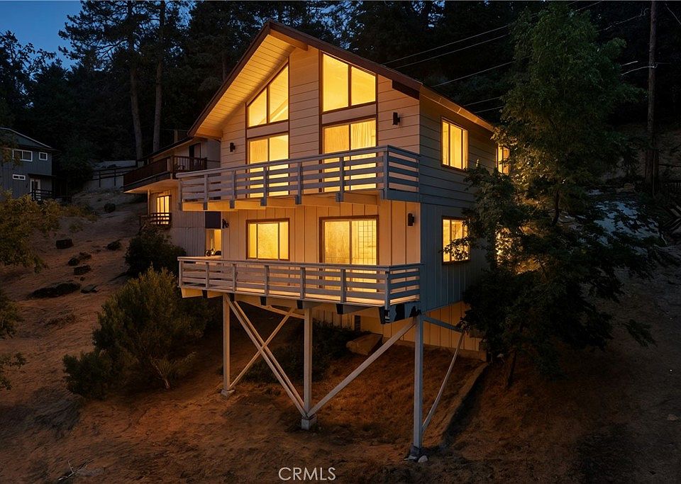 Escape to this inviting mountain cabin, perfectly tucked away in the trees. With a level entry and a desirable orientation with a downtown Crestline view that brings in natural light throughout the day, the open floor plan showcases exposed beam ceilings and expansive picture windows that frame peaceful pine views. The main level flows seamlessly with a spacious kitchen, dining area, and cozy living room anchored by a wood burning fireplace. Upstairs, a loft provides extra sleeping space with a closet, while the lower level features a private primary suite with a full size bath and a family room for relaxing or entertaining. Step outside to two decks that are perfect for morning coffee or evening sunsets. A hidden hatch leads to the laundry area beneath the home, keeping chores discreet and out of the way. Pride of ownership is evident throughout. With fruit trees on the property and just minutes from Lake Gregory, this home offers the perfect blend of comfort, privacy, and convenience, whether you are planning weekend getaways or full time mountain living. Set your move-in style: purchase the home furnished or bring your own.. furnishings are negotiable.