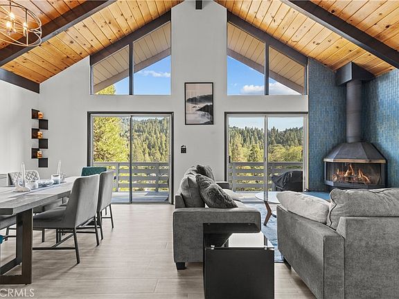 Wood burning fireplacePrivate primary suiteExpansive picture windowsExtra sleeping spaceDowntown crestline viewPeaceful pine viewsOpen floor plan