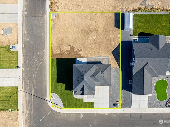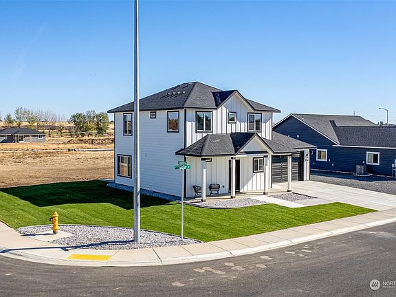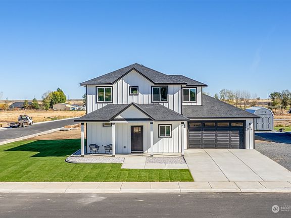 Fantastic home w/ terrific curb appeal! Relax under this great covered patio after a hard day at work. Concrete curbing, newly laid sod and decorative rock finish--this is a ready to move into new construction. This builder pays attention to detail. Soft-close, gorgeous cabinets, waterfall quartz counter top island, luxury vinyl planking, stainless steel appliances and great windows letting in lots of sunshine. Primary bedroom suite, 2 more bedrooms utility room and full bath upstairs. Great room with kitchen, pantry, dining, half bath and perfect spot to take off shoes, coats and hats by the insulated, finished attached double car garage. 11,000 sq ft corner lot has plenty of room for a shop or ADU. Check it out-extra concrete for an RV!