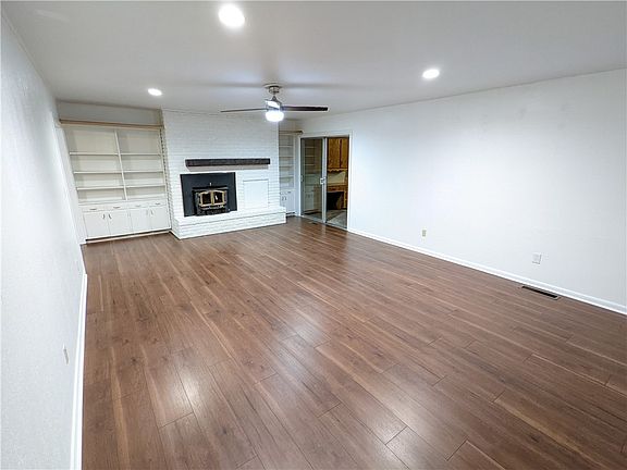 As you drive up to this beautiful home with new roof in 2022, you will immediately note that it conveniently sits on a corner lot with a circle drive. As you enter you will see that it has been lovingly cared for from the beautifully updated kitchen to the new LVP flooring throughout. This ranch-style home has a large open living room, with brick fire place, surrounded by built-in shelving, and new recessed lighting. From the living room, you go through glass sliding doors to the bonus room that would make a great in-law suite, media room, or 4th bedroom with a kitchenette area and full bathroom attached. From there you head outside to the fully fenced yard with inground storm shelter & storage shed. On the other side of the house you will find two bedrooms, a full bathroom, and the master bedroom with backyard access and it's own full bathroom. New water heaters in 2022 and 2023. This house is ready to have a new family love it! 5 minute walk to local elementary school and only minutes from I49. Come see it today!