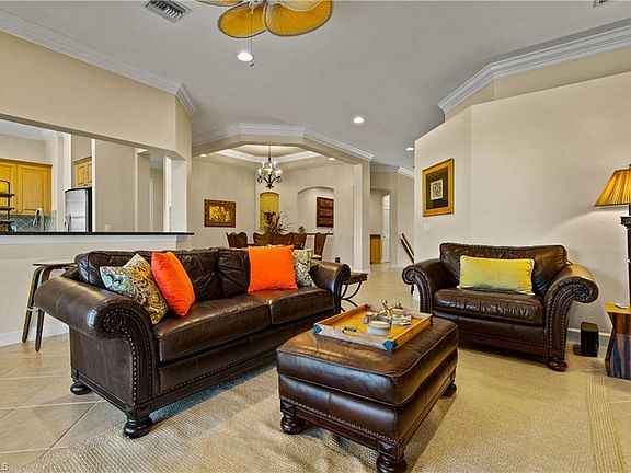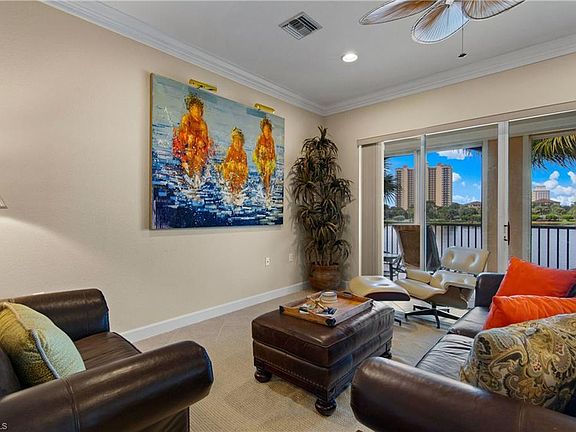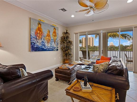 BEST LAKE VIEWS IN MERANO! Large 2nd floor, 3 bedroom plus den condominium located on the lake with West facing sunset and water views. The expansive island kitchen allows for easy entertaining and socializing. Enjoy peaceful evenings on the private screened lanai with tile diagonal tile flooring and electric roll-down storm shutters. The oversized master suite offered private access to the lanai and spacious master ensuite. Further upgrades include crown molding throughout, a private elevator and flex room that can double as a overflow guest room or office. The Colony & Pelican Landing offered wonderful amenities including private island beach park, on-site Bay Club restaurant, fitness, tennis, sailing club, canoe/kayak park, butterfly garden, and much more! Deeply discounted FULL GOLF membership available with the purchase of this home.